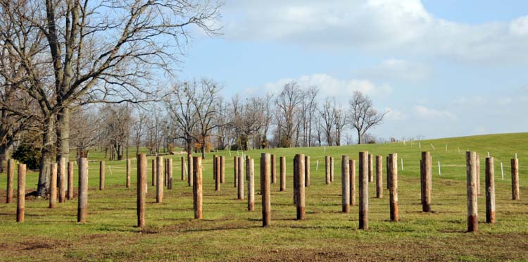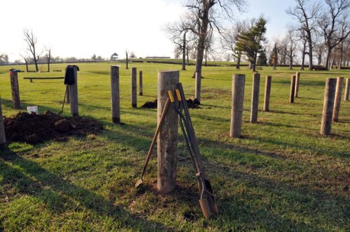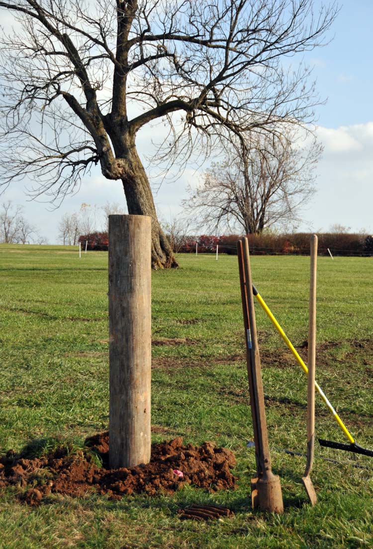 Of course, I’m joking. There’s a whole lot more effort involved in putting all these posts in place. Today, I went out to the site of yet another new WEG marathon obstacle, which I think will be known as “The Hedges.” There, posts were still being wrestled into the ground. And mighty hard work it appears to be, too. As you can see in this photo, some of the posts are firmly in the ground and some aren’t quite yet. While I was there, Aaron, Isaac, and Lenny were hard at work: setting posts in their deep holes (dug by hand with post-hole diggers), making sure they were plumb and level, and laboriously tamping the soft dirt (it has rained, remember) in around them.