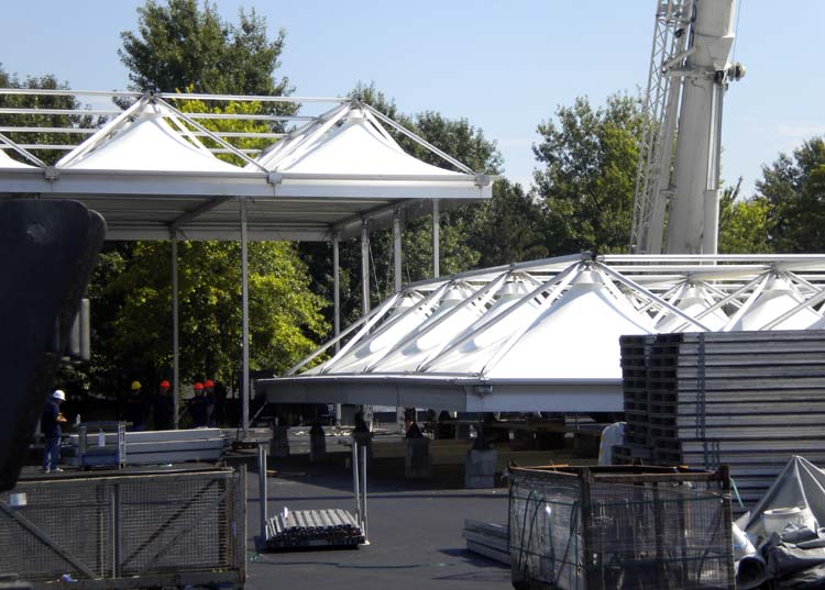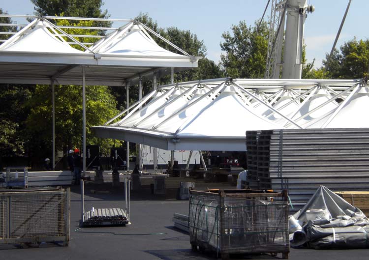 Over the course of this week, I’ve been taking pictures in the mornings and afternoons to chart the progress of the various (enormous) tent complexes going up in the parking lot. Now you can follow along.