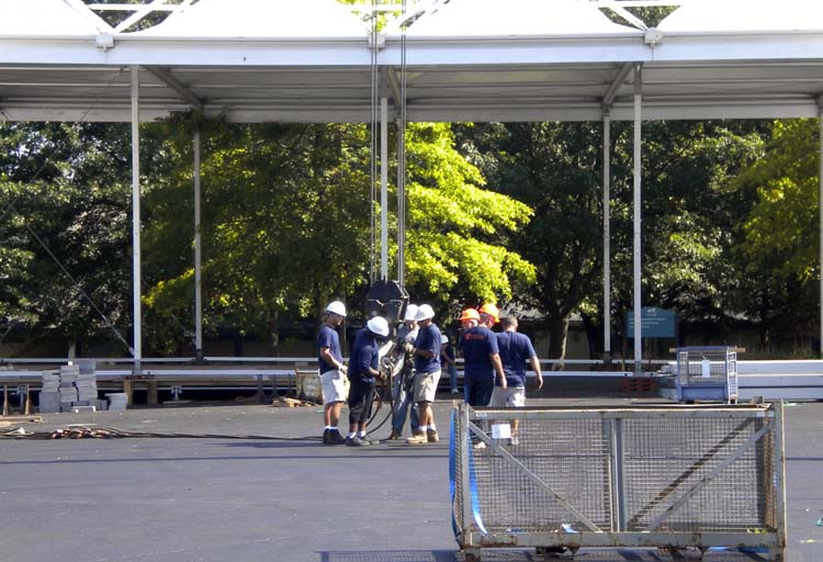 … hang cables on the crane’s hook (you can get an idea of the scale of these tents from the first raised roof, behind the workers)