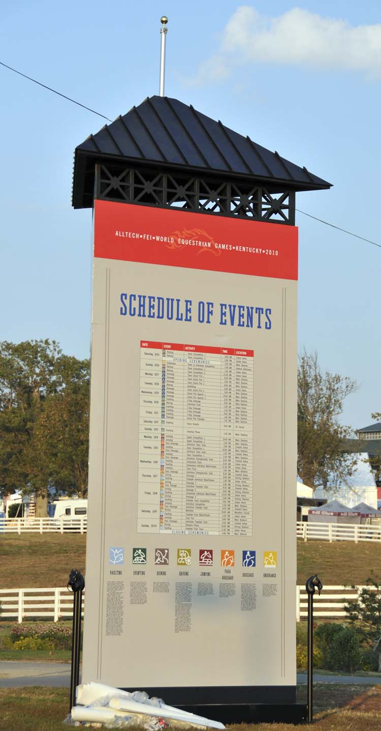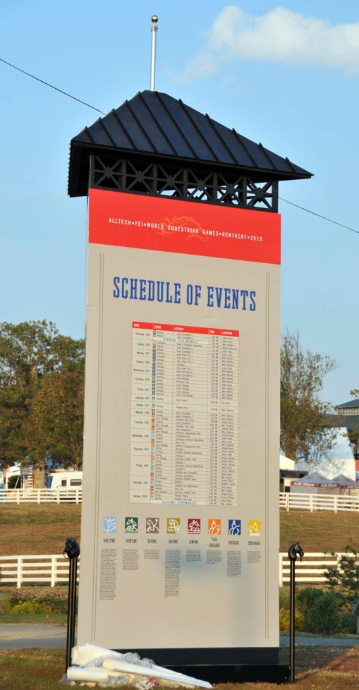 1. There are several of these lovely three-sided towers going up. One side is a sponsor’s ad, one side (as shown here) is a timetable of the entire WEG, and the third side is an extremely handy map, with keys, and a helpful “You Are Here” sign in yellow. We’d been wondering whether there would be maps available … and, while these aren’t exactly portable, they certainly are a help.