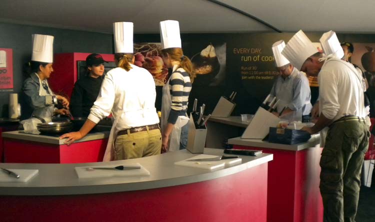on our way from lunch to the trade fair area, we stopped in the booth hosted by the French city of Normandy (site of the 2014 WEG), where they offer free cooking classes every hour (which apparently involves wearing a tall chef’s hat!)