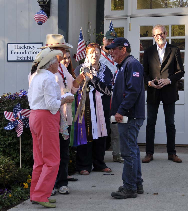 During the party, Jill, Colonel Davis (CAA president), and Kate & Katie Whaley presented the awards for the WEG’s Presentation competition, which was sponsored by the CAA. There were ribbons and cash prizes for the first- through tenth-place winners, plus other special awards: a holly whip for first place (donated by Fleck Whips of Germany and presented by Driving Essentials) and commemorative plates for the first-, second-, and third-place winners, each hand painted by artist Graciela Giacosa of Argentina.