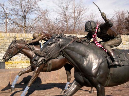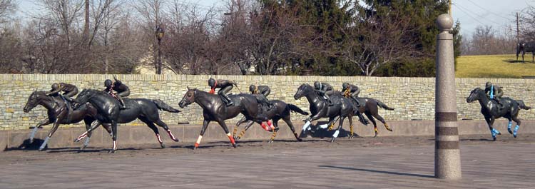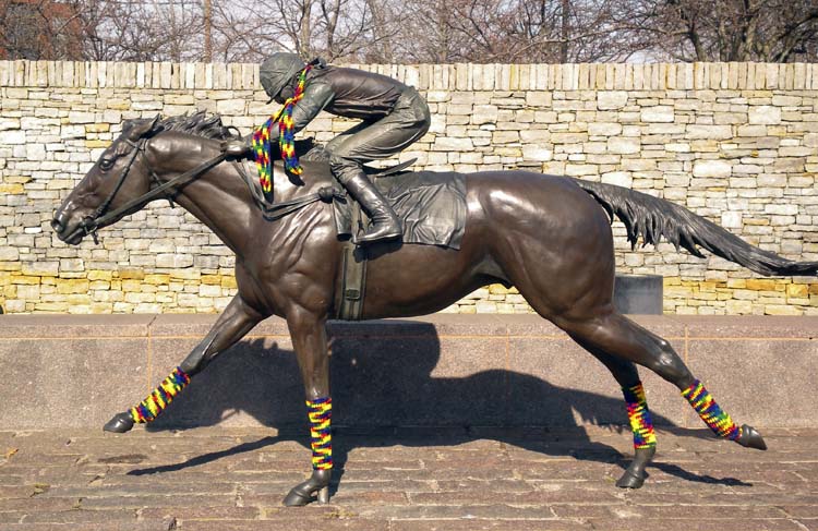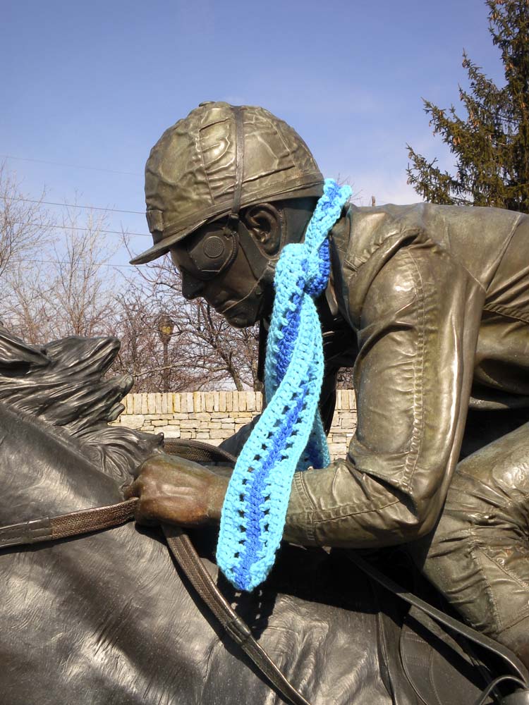 So to alleviate the chill … or just to lighten the gray mood … or perhaps just to have some fun and make people smile … “guerrilla knitters” have been hard at work here in Lexington. Early yesterday morning, A.J. and I drove through downtown on Main Street. At the intersection with Midland Ave. is Thoroughbred Park, which features statues of grazing mares and gamboling foals on a small hill, and a group of race horses, going all out down the stretch.