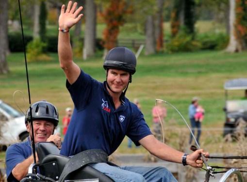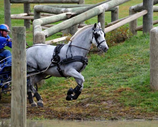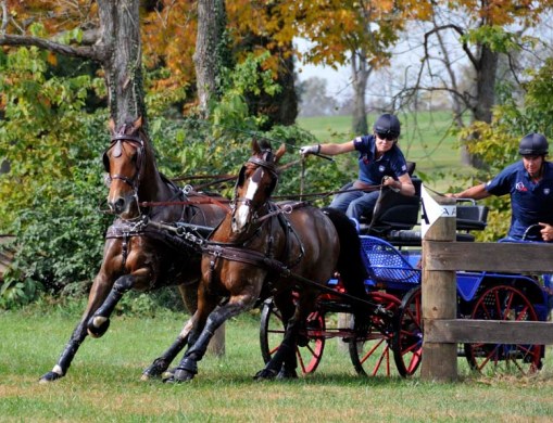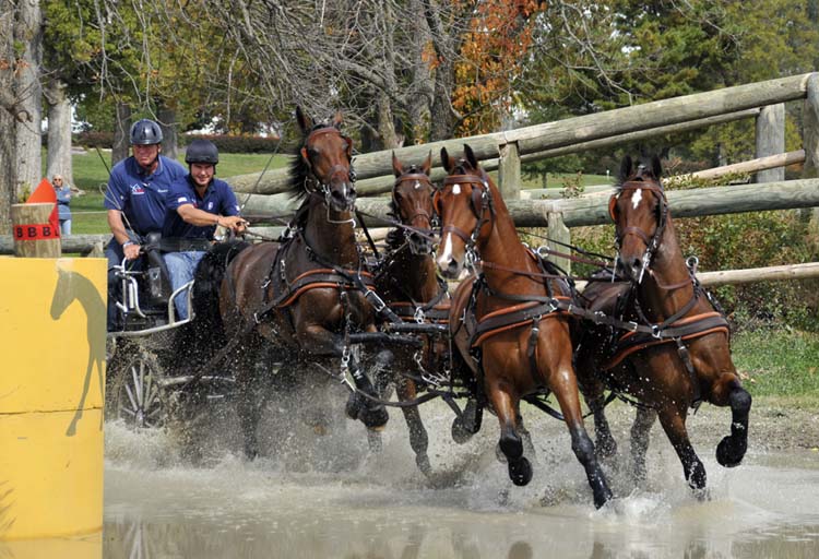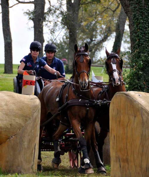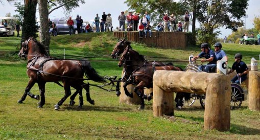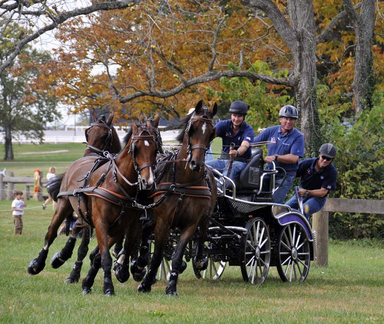 At the very end of the day, Koos de Ronde (a member of the gold-medal team from last year’s WEG) took the reins of a team of four horses and, with Michael Freund as his navigator and James Miller on the back step, gave a thrilling demonstration of obstacle driving. He was followed along the course, from obstacle to obstacle, by an army of people in golf carts and gators, and on bikes, and on foot. And — sometimes at Michael’s urging, but mostly on their own — the crowd cheered and whooped and hollered in appreciation.
