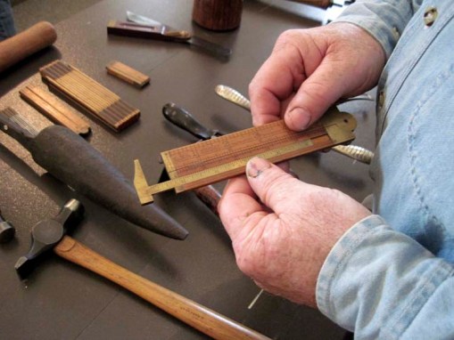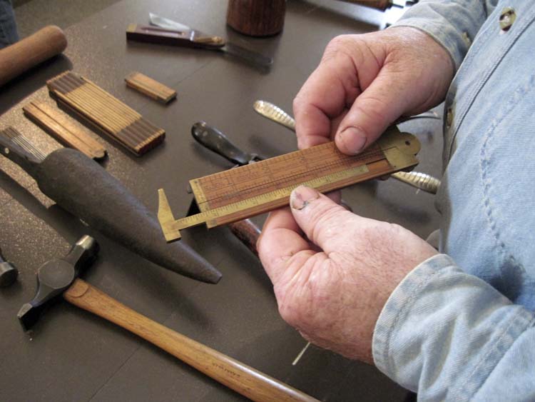Among the many tools on display were spoke shavers; a “traveler” used to measure the diameter of a carriage wheel in order to know what length to cut the steel tire; and many types of rulers, including several with calipers incorporated to measure a piece of stock or wood.