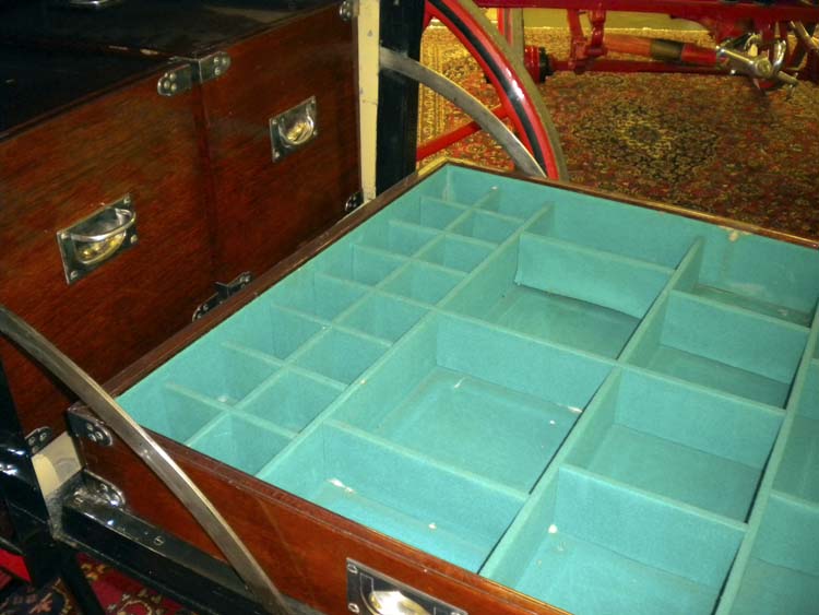 this tray and the two to the left sit in the coach's boot; this one would've held glassware, plates, etc. and the two to the left look like they would've held bottles ... A. G. Vanderbilt preferred "white" metal on his vehicles, instead of brass, so all the silver is sterling