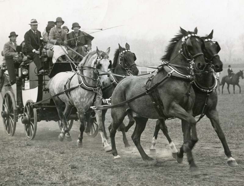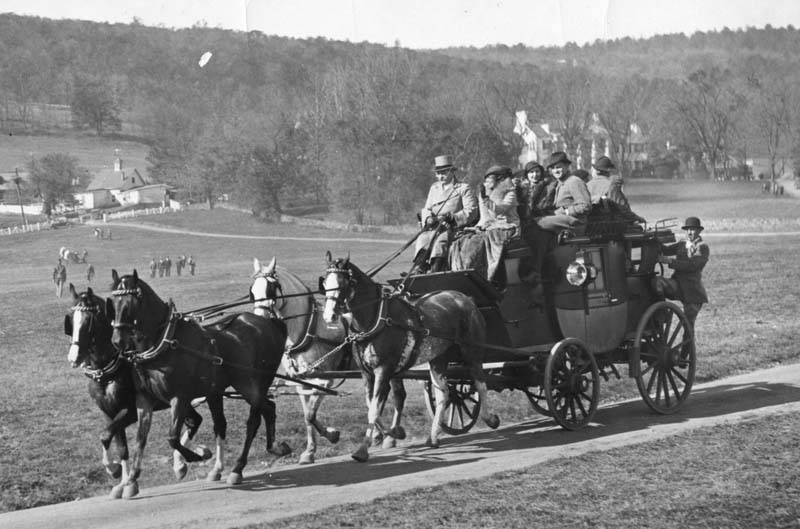 The news-service caption on the back of this first photos says, “W. P. Hulbert driving his coach onto the race course during the third annual meeting of the Piedmont Fox Hounds at Llangollen Farm, near Upperville, Virginia, November 4th, through the courtesy of Mr. and Mrs. John Hay Whitney.” The photo is dated Noveber 4, 1933.
