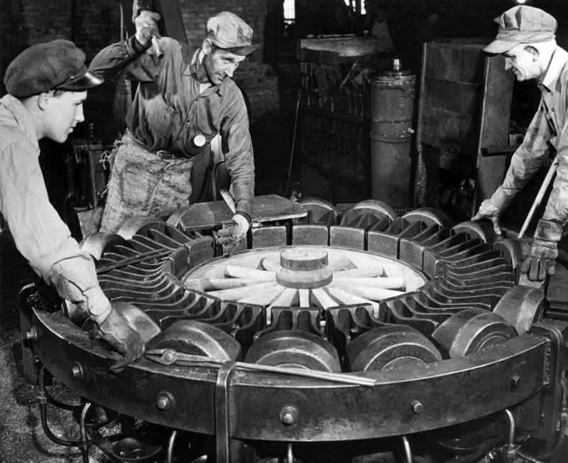 "using a hydraulic press to fit the steel rim into the wooden rim is one of the few uses of the machine age in wagon manufacture at the Owensboro Wagon Company here" (from the Jack and Marge Day collection)