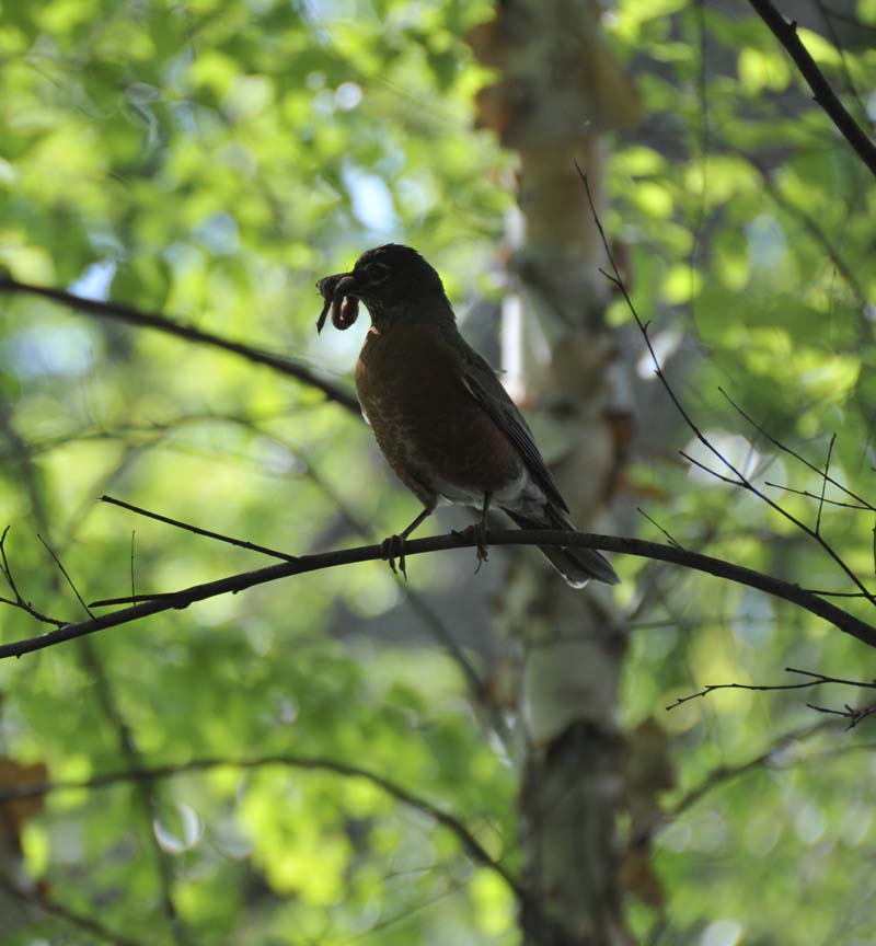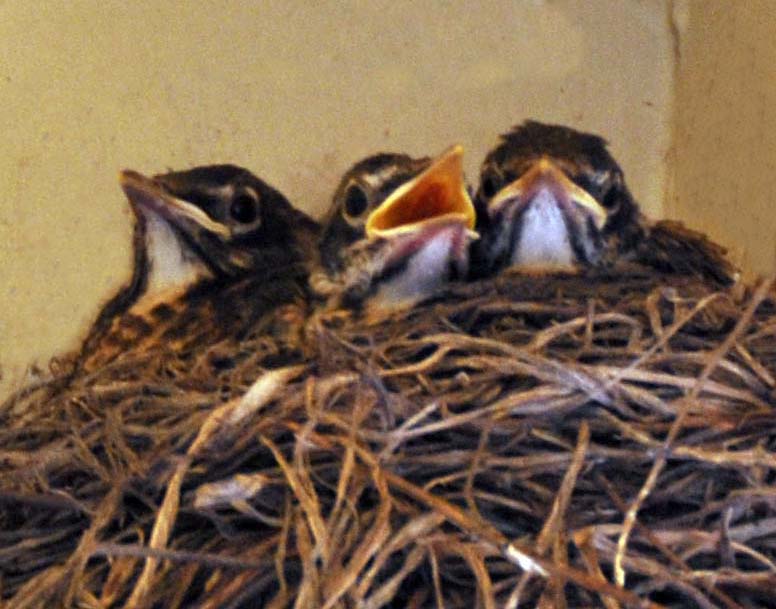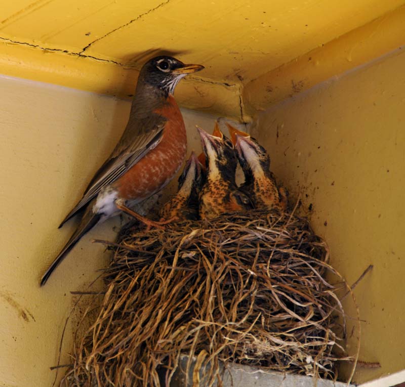 when that parent (above) flew over her head and to the nest, Lila kept an eye on the chirping babies (on the other side of the porch) while lounging on the sofa