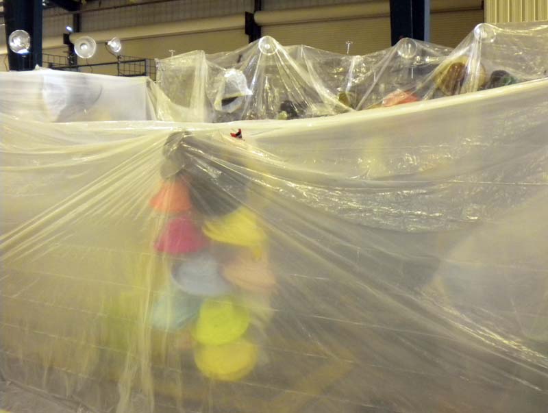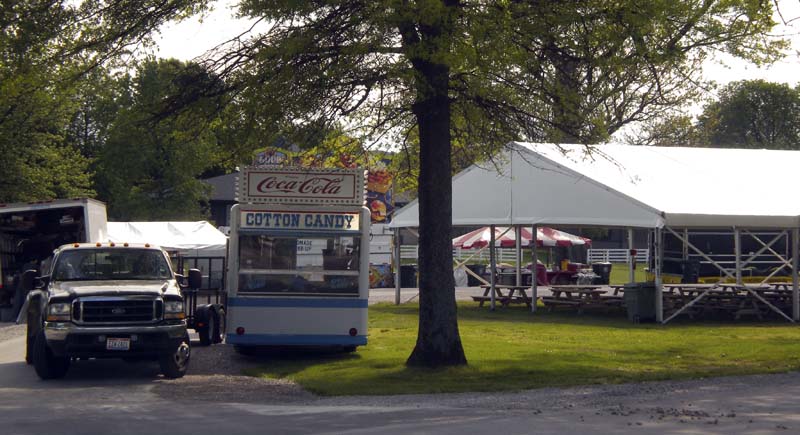 the benefit of living nearby: Katie Whaley is one of the few trade-fair vendors with her booth all set up already; the hats are under wraps for now
