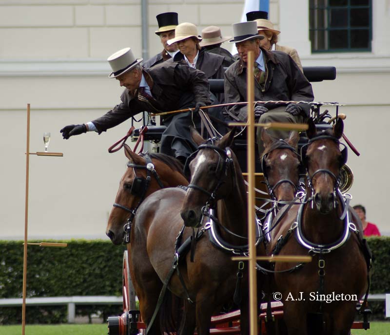 Then, in the center of the arena was the final “test of the drivers’ skill” for the morning’s drive. The drivers had to come to a complete stop next to a stand that consisted of two platforms (at two different heights) on a pole. On one of these platforms (at the appropriate height for each driver) was a glass of champagne. They had to take the glass, drink the champagne, drive (holding the glass, so one-handed) to the next stand, stop there, and set the empty glass on that platform. Here, you can see one of the four-in-hand drivers reaching for his glass of champagne: