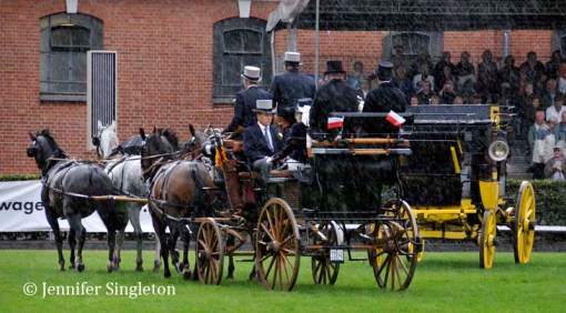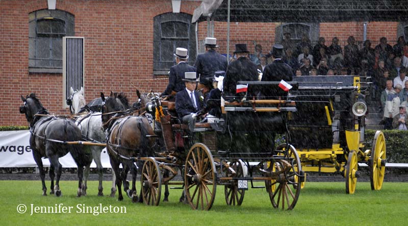 the Polish five-in-hand was the last to go on the cones course and, unfortunately, it poured rain throughout their drive … Can you see the rain?!