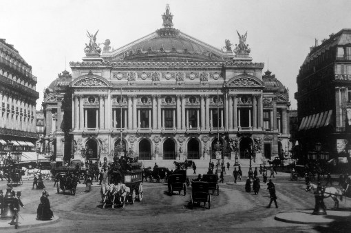 In front of the Paris Opera House, we can see a number of Broughams (serving as taxicabs, no doubt) and a three-abreast of gray horses hitched to a crowded Omnibus.