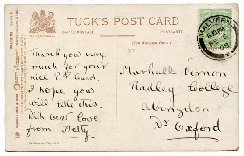On the back, we see that the postcard was sent to Marshall Vernon at Radley College in Abingdon, Near Oxford. The note says, “Thank you very much for your nice [??] card. I hope you will like this. With best love from Hetty.”