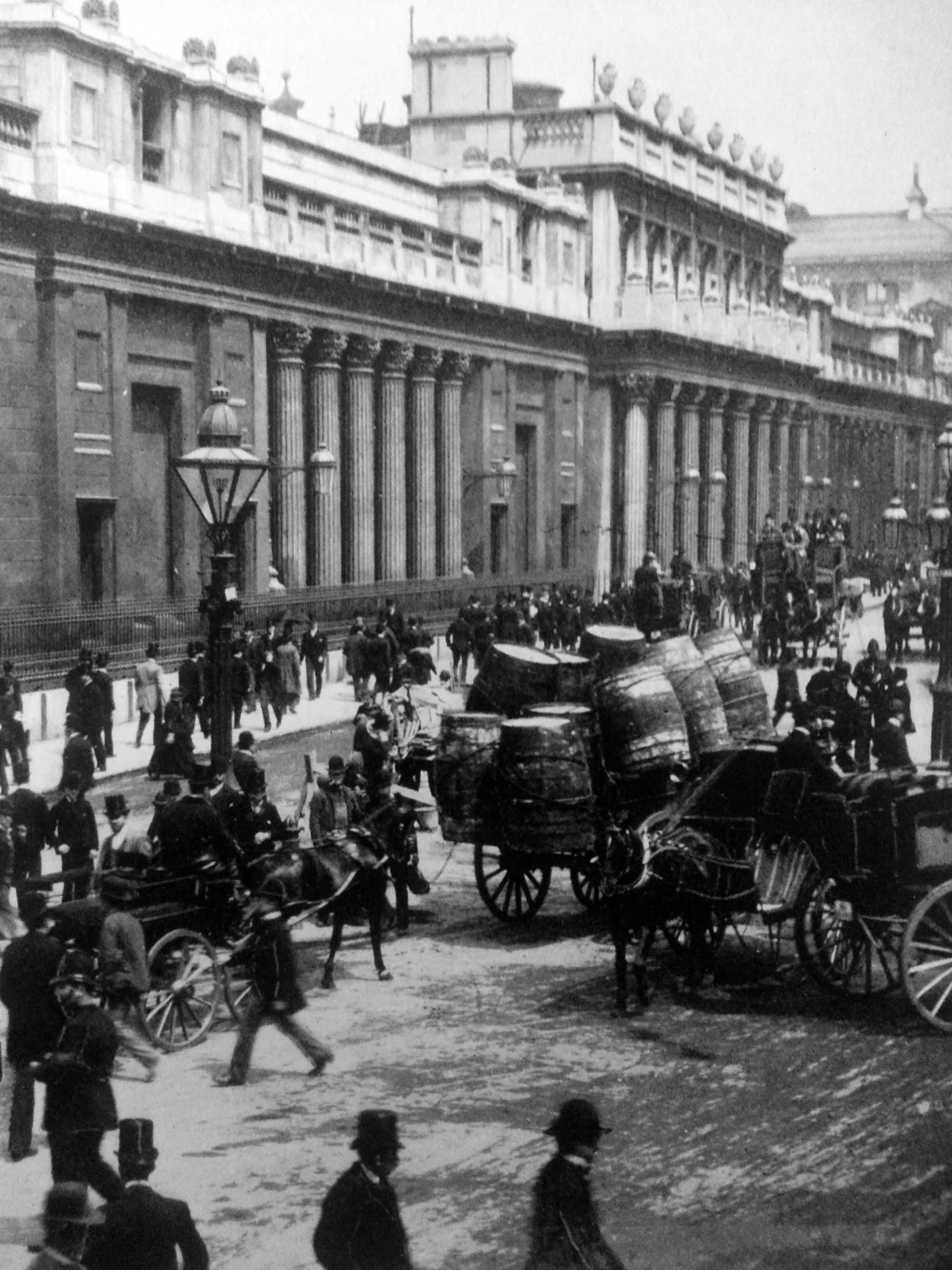 For our next look at a London scene from the 1892 Glimpses of the World book, we have this busy street outside the Bank of England: