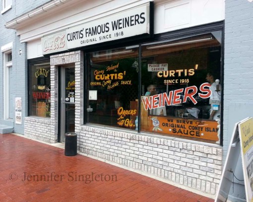 … and, just for fun, a photo of the front window at the shop selling Curtis’s famous Coney-Island hot dogs … since 1918!
