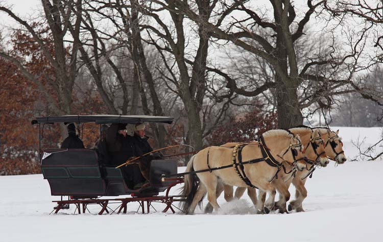 CAA member Ted Swendson drove his Fjords, three abreast, to his antique sleigh at the 2011 CAA Winter Conference in Minnesota (photo by Else Bigton)