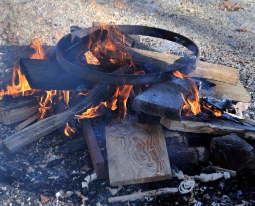 a small fire was started (which felt nice in the chilly weather!), the iron tire placed on top, and then more wood on top of that, so that the tire could expand slightly while buried inside a nice hot fire for about 10 minutes