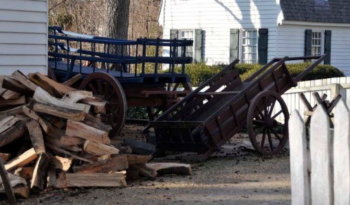 The wheelwrights moved last summer into their new facility … Elkanah Deane’s shop. While I was there, the wheelwrights were installing an iron tire on a newly built wheel for a shop-built wheelbarrow. One of them explained to visitors that the shop builds wagons, wheels and, at this time of year especially, wheelbarrows (one reason being that they’re smaller and can be painted indoors).