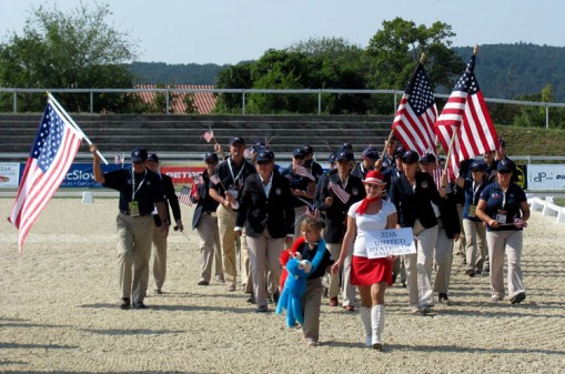 The opening ceremony was conducted on foot with drivers, chefs d’equipe, grooms, helpers, and supporters, including a few children and at least two dogs, from the seventeen nations parading in on foot with flags waving. These varied from nations represented by one driver, such as Australia (represented by “our own” Janelle Marshall, who was accompanied in the parade by Muffy Seaton!) and Finland, to the six nations, including the United States, who have a full complement of drivers.