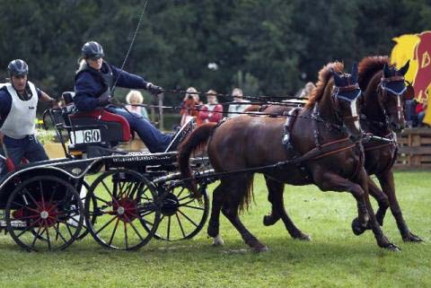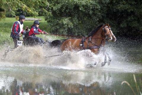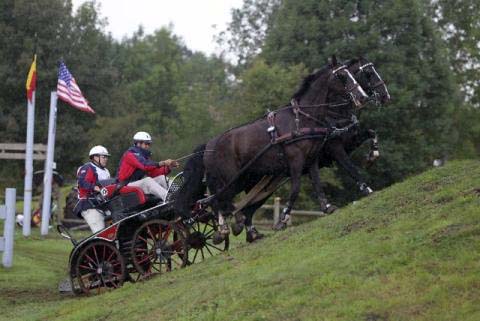 Marathon day, as promised, was quite exciting! The obstacles were technical and tight. Each driver circled the same course five times, making the already mucky and deep course even more disgusting by the end of the day. Kathrin Dancer was the first American to go, and she was quick and nimble with her pair of chestnuts. Misdee Wrigley Miller was the next driver for the U.S.; she had a good round, with no errors of course. It poured down rain while she was driving, making visibility an issue. Joe Yoder was the last American of the day. He had some overzealous horses in the fifth obstacle, who jumped the creek. One landed with his leg over the pole, and down went the navigator. Somehow, they managed to fix it, while remaining hitched! Off he went again, but time was already a factor, not to mention the penalty points for a groom down.