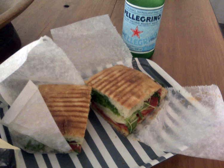 I took this photo with my phone, as that was the only camera I happened to have with me, and I do realize that it’s not the best. The sandwich, however, was pretty darned awesome, as was the one I tried: ham, Swiss cheese, and organic fig spread on toasted whole-wheat bread.
