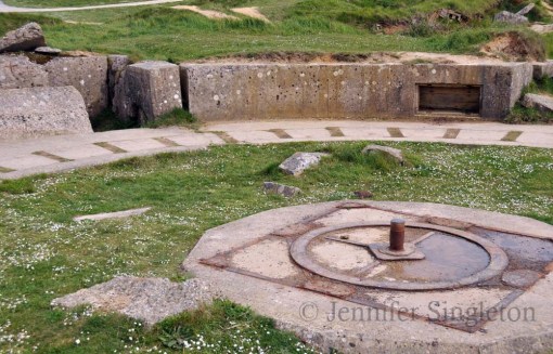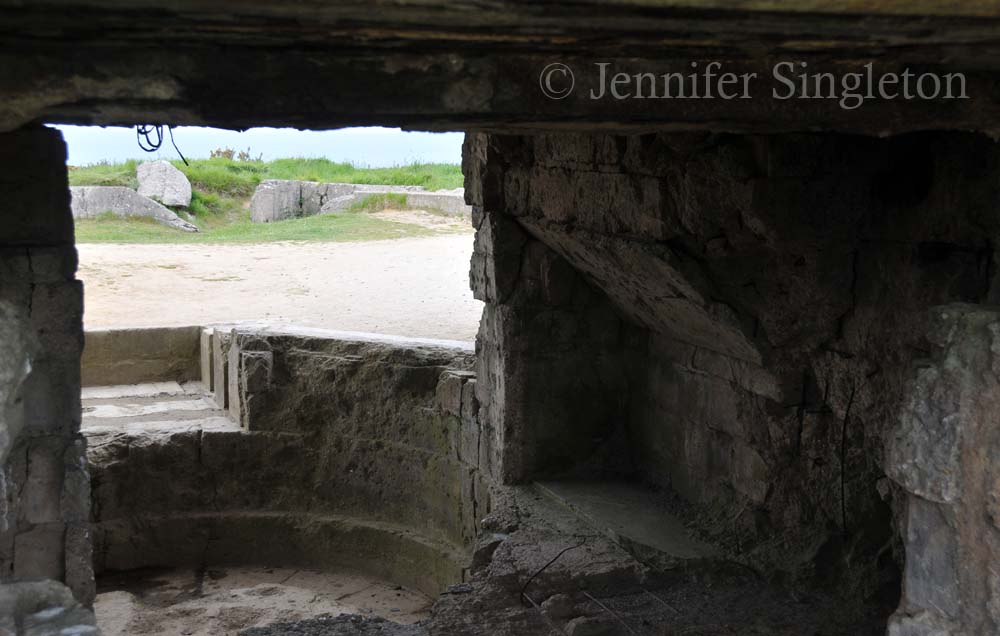 The visitor-information plaque says, “On 6 June, at around 10 a.m., hundreds of men were stuck on this beach amongst the destroyed landing crafts. In front of them was the small Ruquet valley, protected by two fortified points. Today, all that is visible is one large gun in its blockhouse [above]. It was hit by fire from an approaching vessel 1 km (1,000 yards) away, and was destroyed for good by a ‘half-track.’ The U.S. engineers immediately opened this road toward the plateau, and at around 3 p.m., the heavy U.S. equipment took this first, and only, cleared exit from the Omaha site. The 1st Division ‘Big Red One’ used the blockhouse as a command post, and soon, thousands of GIs took this road to liberty.”