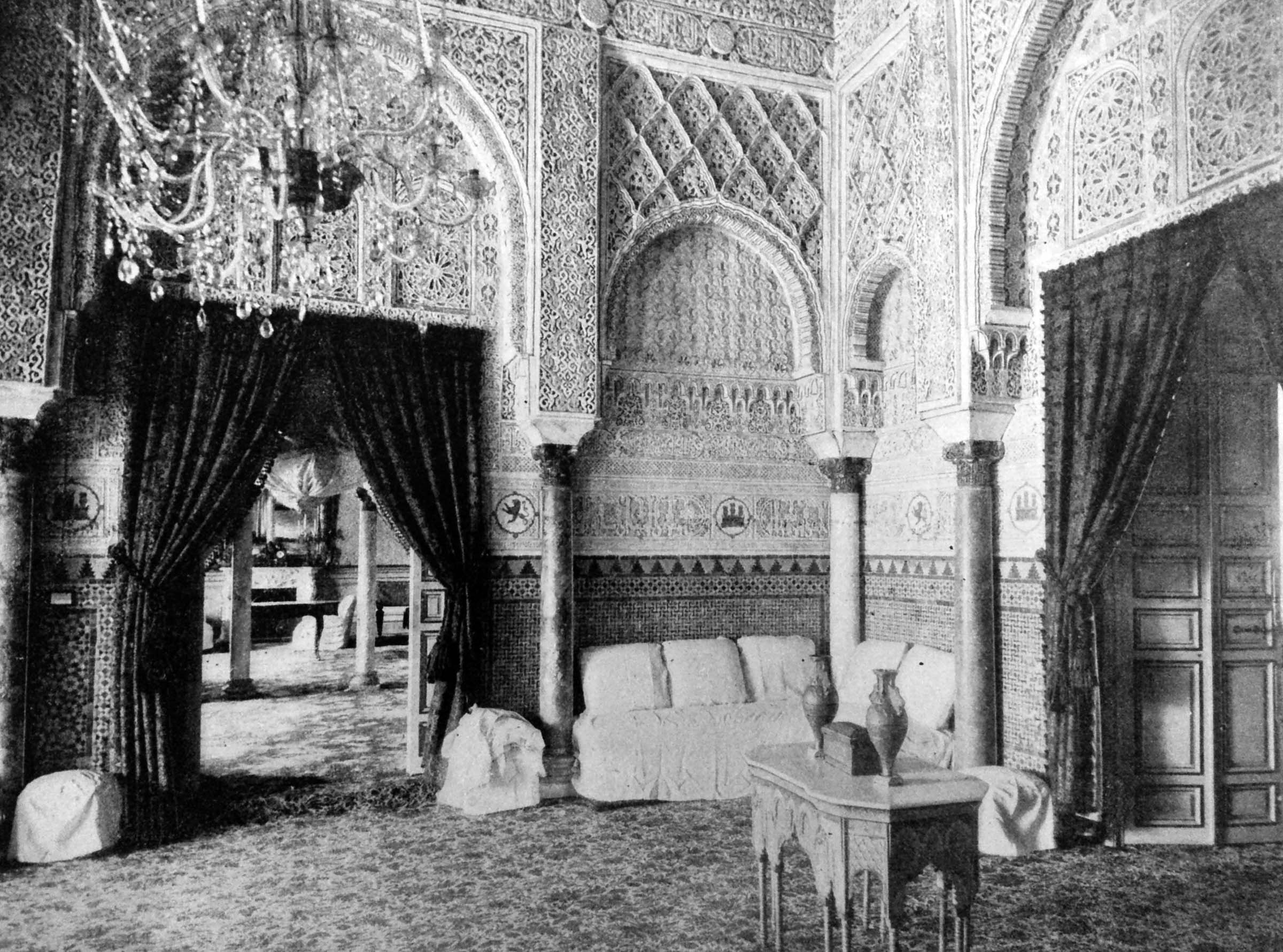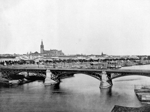 The book’s caption for this photo reads: “From the summit of the old Moorish spire, the Giralda [the tall spire in the photo above, originally a minaret and now the cathedral’s bell tower], the view of Sevilla is one of exquisite beauty. Clasping it in beauty, like a silver girdle, is that stately river, whose Moorish name (the Guadalquiver) sounds, even when pronounced in English, like a strain of music. It is a very ancient city, famous for distinguished men, lovely women, palm trees and orange groves, charming courtyards, fine churches, and many rare paintings by Murillo and Velasquez. From Sevilla two of the most celebrated Roman emperors, Hadrian and Trajan, went forth to wear the imperial purple of the world. Here the gifted Moors reigned for many centuries in splendor. Each house in Sevilla, however plain its exterior may be, will have its pretty courtyard paved with marble and enclosed by walls enameled with glazed tiles. In these charming patios occur in the soft delightful evenings of Sevilla the little informal social parties, which render a residence here agreeable. A few modern squares are to be found here, but it is often unpleasant to cross their broad expanse of fiery sunlight, and the narrow, Moorish streets, into which the sun only fully enters for an hour at noon, seem better suited to its climate.”