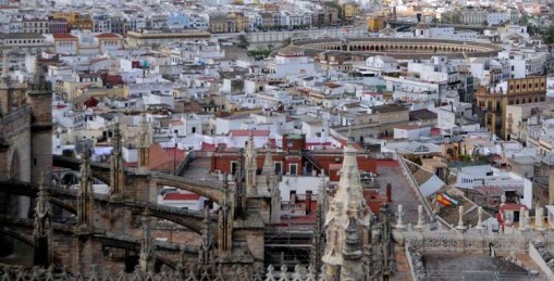 the view (in one direction) from near the top of the Giralda; the bullring (location of the carriage exhibition on Sunday) is near the upper right corner