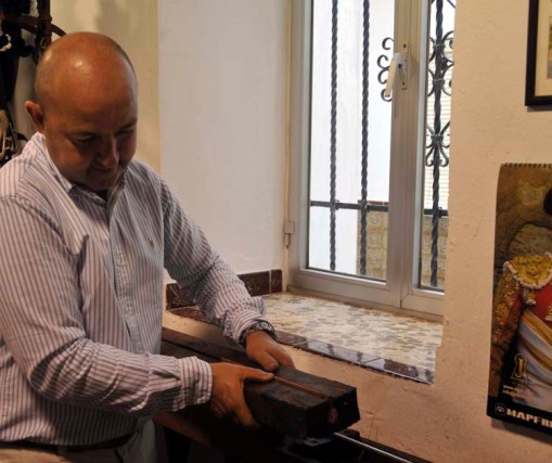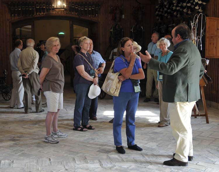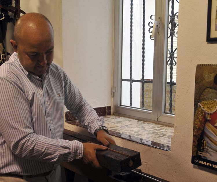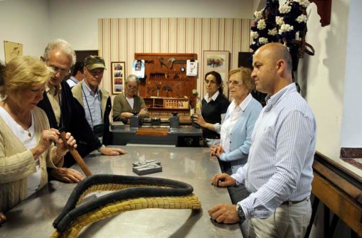 When it came time for our visit to Carruajes Alba, our bus driver and I called my contact person at the shop, Javier, who met us on the road into the small town of Lebrija and guided us in. It’s a good thing there were no more than twenty-five of us and that we were in a half-sized bus. A full-sized one would never have been able to squeeze through and into (or out of) some of the places we went!