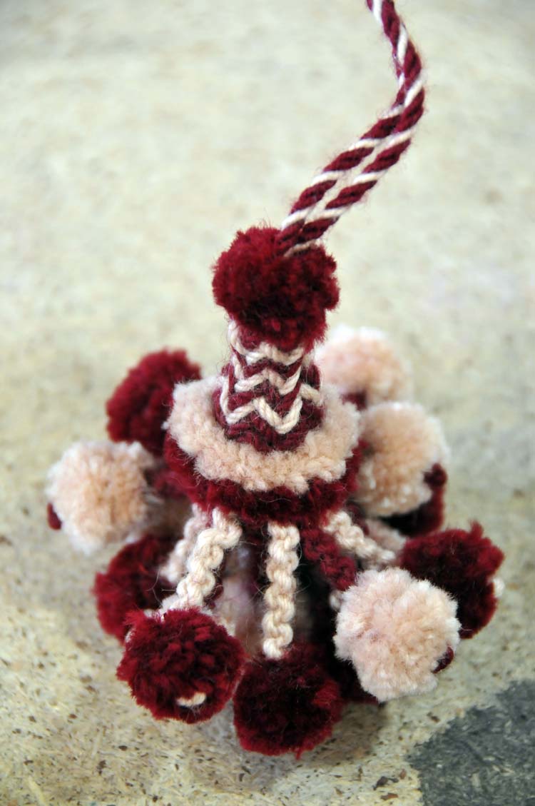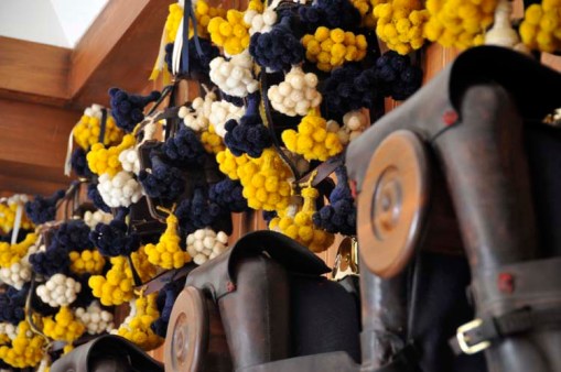 While Luis is in charge of the vehicle restoration / conservation work, Maria Angeles does all of the fabric / coach lace restoration, and she makes braiding and bridle “pom-poms” like this one: