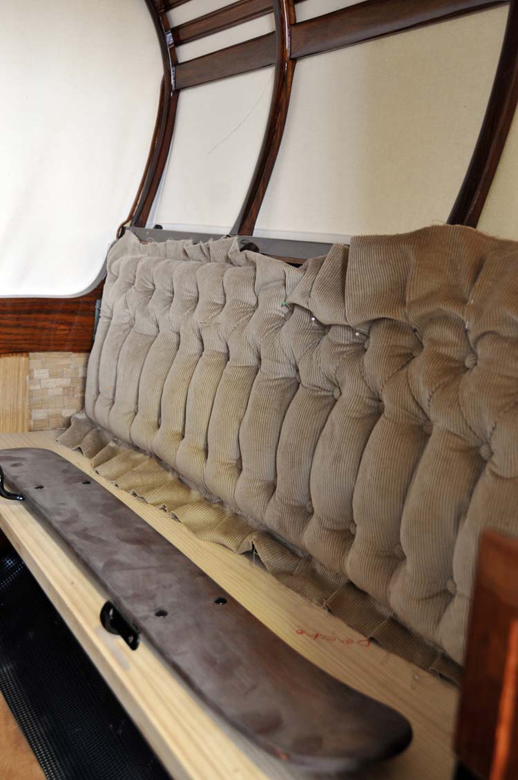 This is the interior of a covered wagon of sorts, with two inward-facing bench seats and a rounded canvas top.