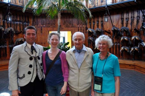 During the intermission, Maria Angeles invited Vicki (as our highest-ranking CAA “VIP” … she’s a past president), me, Raimundo, and Pepe (who was our “local” guest) to take a quick tour of the stables. What a treat! Vicki was introduced to all of the riders, and then we had our photo taken with them: