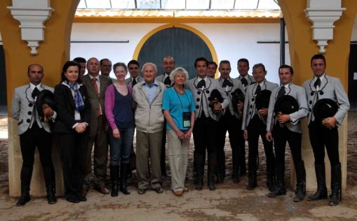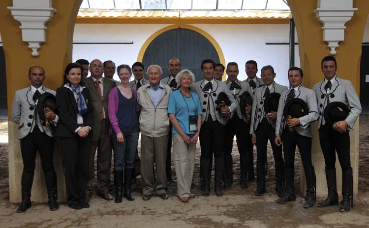 Maria Angeles, Raimundo, me, Pepe, and Vicki with the Real Escuela's riders; third from the right is Rafael Andrade Soto and on the far right is Ignacio Ramblas Algarin, both of whom have represented Spain in major international dressage competitions