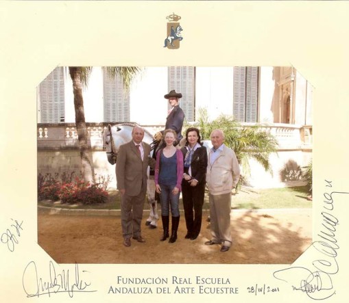 standing in front of the Spanish horse and rider are (left to right) Raimundo Coral Rubiales, me, Maria Angeles Mata Lagomazzini, and Pepe Carmona