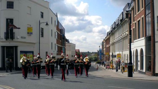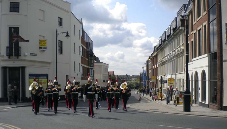 the band and guards as they walk up through Windsor town from the barracks to Windsor Castle for the changing of the guard (photo by Jill Ryder)