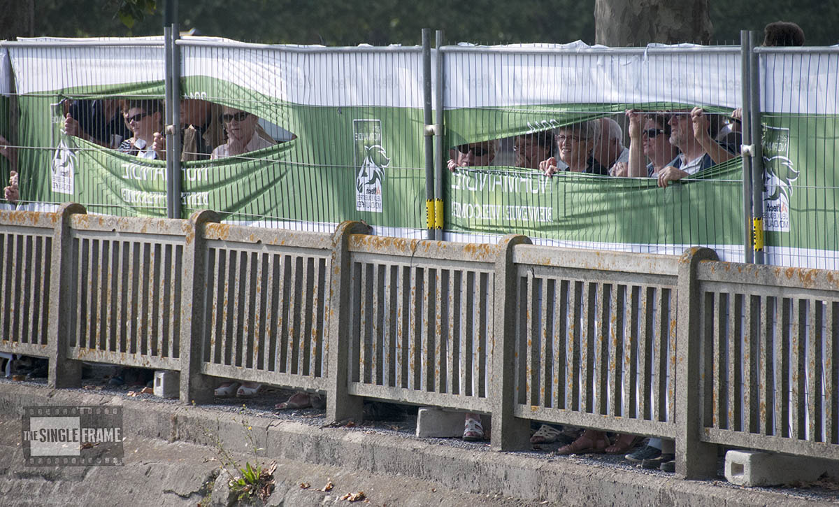 Along the sidewalks of two streets, the spectator area of the marathon course was separated from the outside world by a long line of fencing with cloth banners designed to keep the non-ticket-holding public from getting, or even looking, in … but that didn’t completely work as planned. The alternate title for this photo, of course, is “Eeek, the fence is watching us!”