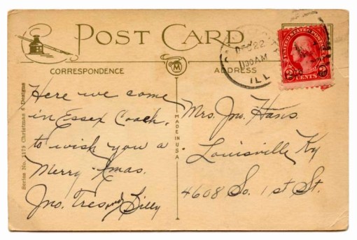 My plan for these postcards is to put them in small frames and use them as Christmas decorations. But that hasn’t happened yet, which means they’re still easily scan-able … so I’m going to share them with you here. And today is a good day to start this project, I figure, as we’re ONLY TWO WEEKS away from Christmas!