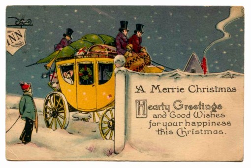 I have a few paper-based collections, not counting shelves full of old books: a few original nineteenth-century coaching prints (which are framed and hanging in our living room), quite a number of original orange-crate labels (some of which are framed and hanging in our kitchen, and the rest of which are destined for the walls of another room), and a small but growing collection of old Christmas postcards with pictures of horse-drawn vehicles.